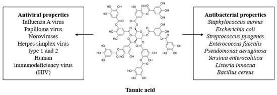Tannic acid is a naturally derived compound which has attracted scientific interest owing to its unique antimicrobial properties. Tannic acid is an interesting compound studied due to its antiviral as well as antibacterial effectiveness. Activity against different viruses, i.e. Influeneza A, Papilloma, noroviruses, Herpes simplex type 1 and 2, and human immunodeficiency virus (HIV) were also reported. Moreover, TA showed activity against Gram-positive and Gram-negative bacteria e.g., Staphylococcus aureus, Escherichia coli, Streptococcus pyogenes, Enterococcus faecalis, Pseudomonas aeruginosa, Yersinia enterocolitica, Listeria innocua.