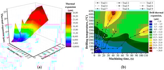 Results of finite element modeling of drill thermal expansion. (a) evaluation of drilling thermal expansion depending on machining time and drilling temperature; (b) Drill thermal expansion Plane Projection.