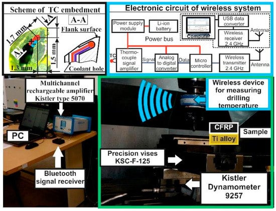In the present study, the experimental set up was implemented at the 5 axial DMU 85V CNC (Computer Numerical Control) milling center (DMG MORI, Pfronten, Germany) (Figure 3). The CFRP/Ti alloy sample was fixed on a new precise wise Schunk Kontec KSC-F-125 (SCHUNK GmbH & Co. KG, Lauffen/Neckar, Germany) with an error of location of 0.02 mm, which was clamped to the Dynamometer Kistler 9257 (Kistler Group, Winterthur, Switzerland) at the machine table. According to the aim of the study, during drilling trails, the thrust force and drilling temperature were measured. Thrust force was measured using a three-component dynamometer Kistler 9257 (Kistler Group, Winterthur, Switzerland) with a frequency of 200 Hz. The signal of the thrust force was transmitted to a multi-channel amplifier Kistler 5070 (Kistler Group, Winterthur, Switzerland), then to a A/D board and recorded on a personal computer (PC) using DynoWare software. The drilling temperature was measured via a rotating wireless temperature measuring system, which was clamped on an HSK63 collet chuck with a collet screw. The functioning of the system is based on a combination of Seebeck effect measurement with cold junction compensation and wireless high-frequency transmission of the thermocouple signal via Bluetooth channel. This system was powered using Li-ion batteries and consisted of a K-type thermocouple connected to a thermocouple signal amplifier, which transferred the signal to a Bluetooth module. After that, the wireless Bluetooth signal receiver captured the drilling temperature signal and transferred it to the PC with a USB interface converter to the COM port. Self-developed software captured the signal from the COM port and recreated it in real-time on the PC screen and into an Excel file. The thermocouple was embedded under the flank surface of the twist drill in a mechanically-grinded bind groove through the coolant hole at the distance of 1.3 mm from the cutting edge and 1.7 mm from the outer corner. The temperature measurement range of the K-type thermocouple was 40–1036 °C with an accuracy of 0.5 °C. The sampling frequency of the wireless temperature measuring system was 200 Hz, with a signal transmission frequency of 2.4 GHz. Simultaneous measurements of thrust force and drilling temperature made it possible to determine the drill position [,,] and drilling temperature in the hole when drilling the CFRP/Ti stack via a computer time comparison with an accuracy up to 100 ms.