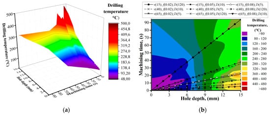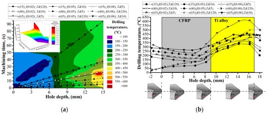 Drilling temperature when machining hole No. 1 in CFRP/Ti alloy stack; (a) evaluation of drilling temperature depending on machining time and hole depth; (b) Drilling Temperature Plane Projection.