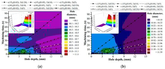 The hole diameter measures in hole No. 1. (a) Distribution of hole diameter under the conditions of the machining time and hole depth for hole No. 1; (b) distribution of the hole diameter in terms of machining time and hole depth for hole No. 5.