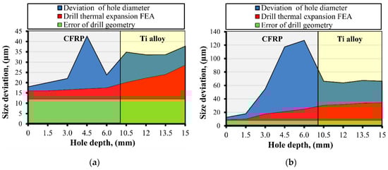 According to Figure 6b, it is supposed that the increase in hole diameter was influenced by the sliding of the rough Ti alloy chip at the CFRP hole wall generated under the high feed rate as it was described in [,,]. At the same time, in trail No. 6, which was also run under high feed but also under CDM conditions, the deviation of hole diameters varied from 10.070 mm to 10.127 mm. The factors which differ with the three abovementioned trails, except cutting speed, were HDM and CDM conditions. So, it could be concluded that the shrinkage of the hole diameter in CFRP was affected not only by chip sliding but also by the drill bit temperature. In the Ti alloy, the hole diameter varied from 10.034 mm (trail No. 6) to 10.120 mm (trail No. 7). Deviation of the hole diameter in the Ti alloy was affected by the radial run out of the drill (Table 2), with feed per minute as a function of time being necessary for the positioning of the chisel edge, similar to what was observed in Reference [], and drill bit temperature. It was observed that for trail pairs No. 2 (vf = 23.85 mm/min) and No. 4 (vf = 25.46 mm/min), No. 3 (vf = 38.16 mm/min) and No. 7 (vf = 41.38 mm/min), and No. 6 (vf =101.84 mm/min) and No. 8 (vf = 103.45 mm/min), the hole diameter and its deviations were bigger in trails No. 4, No. 7, and No. 8, where the drill bit temperature was higher in comparison to the drilling temperature in trails No. 2, No. 3, and No. 6. It appears to contrast to the findings in Reference [] that the hole diameter oversize mostly rises with a feed rate increase. In Reference [], it was reported that the deviation of hole diameter could be reduced up to 60 µm in CFRP and Ti alloy layers by utilizing peck drilling techniques in combination with the MQL technique. It creates favorable conditions for chip crushing and minimizes heat generation in the interface tool-workpiece zone. In an experimental study on drilling mechanisms and strategies of CFRP/Ti stacks [] which run under the same range of cutting parameters and almost similar tool geometry, authors reported for CFRP-Ti a cutting about up to about 175 µm of deviation in the hole diameter in CFRP and up to 25 µm in the Ti alloy, which totally corresponds to the results reported in the present study. However, the components of which the hole diameter deviation consisted were not reported. Based on the measurement of drill bit geometry (Table 2), results of FEA of drill bit thermal expansion (Figure 2), and measurements of hole size (Figure 6), the components of hole diameter deviation were evaluated (Figure 7).