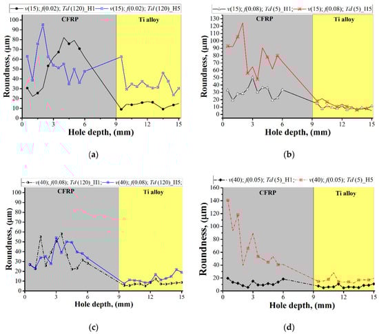 Feature analysis of hole roundness uncovers trends for a significant effect of cutting conditions and drilling temperature on hole roundness in CFRP (Figure 7). In References [,,], roundness varied from 15 µm to 35 µm, which correlates with the results. Taking into consideration the measurement of the drilling temperature (Figure 4b) and the related discussion, it becomes more evident that the distribution of heat in CFRP reduces the adhesion connections between the fiber and epoxy. In research focused on studying frictional heat and cutting temperature of CFRP [] as well as in the study of temperature-dependent properties of CFRP, the phenomenon of decreasing of interfacial shear strength and fracture toughness was reported []. In Reference [] it was described as the indirect connection of drilling temperature and residual stress under the machined surface of the CFRP/Ti alloy. However, the results regarding the actual effect of the reduction of CFRP mechanical properties on hole diameter or roundness have not yet been produced. In the present study, the analysis of roundness is presented (Figure 8).