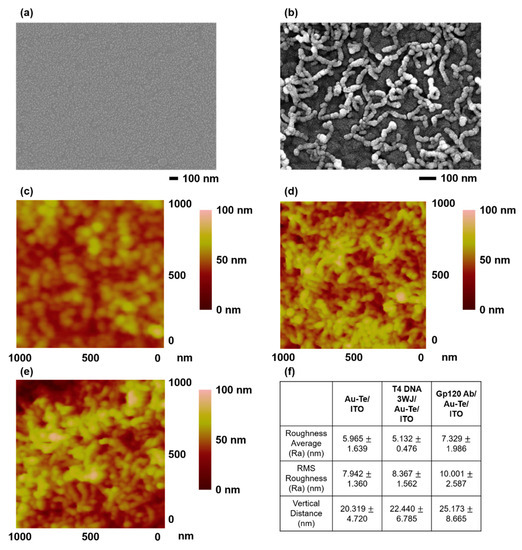 The surface of the ITO substrate immobilized with biomolecules/Au–Te was investigated by AFM and FE-SEM. Figure 2a,b shows the FE-SEM results before and after immobilization of Au–Te nanoworms structure on an ITO substrate. Figure 2b shows that the earthworm-shaped Au–Te nanoworms structure was well immobilized on ITO. The Au–Te nanoworms structure immobilized on the ITO substrate were approximately 200–220 nm in length and 20 nm in height. Figure 2d,e shows the AFM results after immobilization of T4 DNA 3WJ and GP120 antibody on Au–Te/ITO substrate. An increase of approximately 2–3 nm in height was measured on substrates immobilized with T4 DNA 3WJ (Figure 2d). Figure 2e shows that the total vertical height increased by 5 nm due to the addition of the GP120 antibody to the Au–Te particles immobilized with EDC/NHS. Compared to the Au–Te nanoworms structure, the surface morphology and surface roughness analysis showed different shapes and values. When the biomolecules (T4 DNA 3WJ and GP120 antibody) were added on the Au–Te nanoworm-modified substrate, respectively, we found some of the values and morphology changed. Presumably, the interaction between some of biomolecule and nanostructure gives the difference of values. Moreover, the increment of vertical distance can be interpreted to be stacking of biomolecules on the Au–Te nanowrom structure. The overall result confirmed that the biomolecule/Au–Te layer is well immobilized on the ITO substrate.