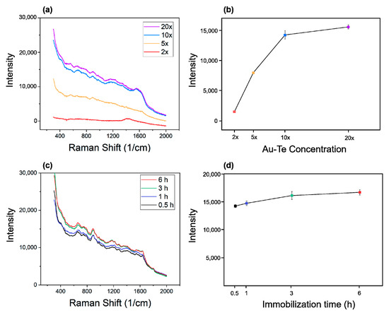 In order to maximize the Raman enhancement effect of Au–Te particles, we monitored the change in Raman intensity by varying the concentration and immobilization time, and set the optimal concentration and immobilization time accordingly. Figure 4a shows the Raman spectra at various concentrations of Au–Te (1× reference absorbance Figure A1). The initial 2× spectra were the Raman spectra of ITO itself, indicating presence of few Au–Te particles. The Raman intensity was observed to increase with increasing Au–Te concentration (Figure 4b). The plot of the Raman spectrum of Au–Te 10× particles with immobilization time is shown. The Raman intensity gradually increased with immobilization time. However, after 3 h, the spectrum was almost the same. As a result, we adopted a 10× concentration of Au–Te and a 3 h immobilization, as this showed the greatest efficiency.