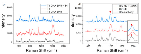 SERS measurements were performed for DNA 3WJ aptamer-thyroxine binding, GP120 antibody GP120 protein binding, and myoglobin. SERS was measured using a SENTERRA confocal Raman spectroscope (Bruker Optics, Billerica, MA, USA) using a 785 nm diode laser with 10 mW power; an exposure time of 5 s was set for all experiments. Raman spectra were obtained using the average results from 10 different points in 10 independent samples.