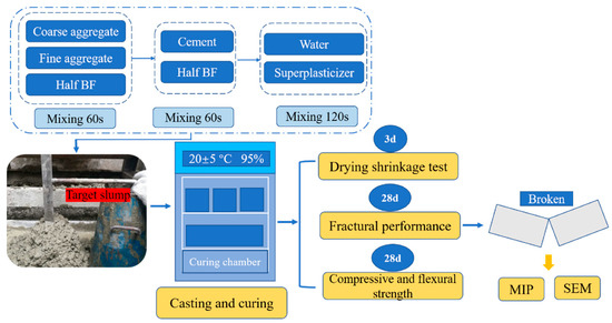All solid ingredients including sand, coarse aggregate and half mass of basalt fiber were first mixed for 60 s in forced concrete mixer (Keda Co., Cangzhou, China), then pour out rest of basalt fiber and cement into a blender and remixed for 60 s. The next step was to add water and water reducer, and then, the mixture was remixed for 120 s. Casted the mixture into molds and vibrated on a high-frequency vibration table. Finally, moved specimens into environment room with the condition of 20 ± 5 °C temperature and 95% humidity for curing. The diagram of test program is given in Figure 2.