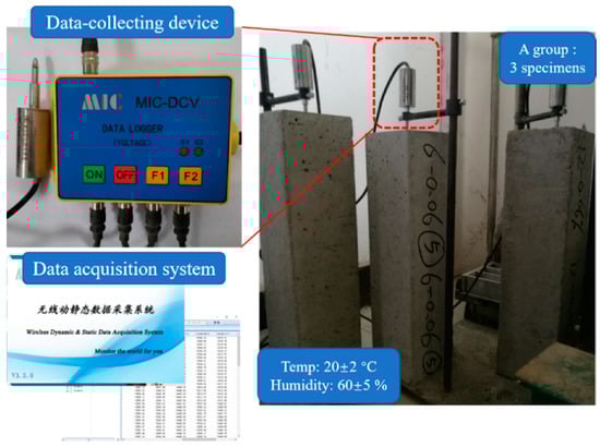 For continuous monitoring the shrinkage strain of concrete as curing time increase, voltage data collector was matched with displacement meter, as can be seen in Figure 4, were used for data measurement and collection. After curing 3 days, settled specimens in condition of 20 ± 2 °C temperature and 60 ± 5% humidity for shrinkage test, as shown in Figure 4. Each series of BFRCs had three specimens.