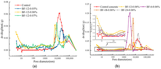 An MIP test was carried out to investigate the pore structure of concrete with various contents and lengths of BF. The pore size distribution curves of each BFRC sample and the control concrete are shown in Figure 5. The highest value of the curve represents the highest proportion of pore volume in the concrete, which is also called the most likely aperture. In Figure 5a, it can be seen that the addition BF-12-0.06% and BF-12-0.07% moves the peak value to the left, meaning that it lowers the most likely aperture value. Comparing the cumulative pore volume of control concrete and BFRCs at pore sizes ranging from 10 to 1000 nm, it can be observed that the addition of BF increases these micropore contents. As the BF content increases from 0.05% to 0.06%, the peak value in the range of 5000 to 500,000 nm gradually moves to the left. These attained results clearly suggest that the addition of BF decreased the coarseness of the pore size and refined the pore structures. A similar trend was also reported by Zhang et al. [18], who also found that concrete with BF presented higher microporosity than base concrete. However, there existed a peak value where the pore size was nearly 100,000 nm, and the porosity of the BFRCs was higher than that of the control sample. The reason could be ascribed into two parts. Firstly, the addition of fiber may introduce a large number of bleeding channels or internal cracks during the hardening process of concrete [31]. Secondly, the samples which are prepared for the MIP test are obtained by cutting, which may change the pore structure [18]. Moreover, we can see that the peak appears in 100,000 nm is much smaller than that which appears around at 10,000 nm, indicating small amounts of pores with a size of 100,000 nm, therefore, the refined effect of fibers on the pore structure of concrete could also be concluded.