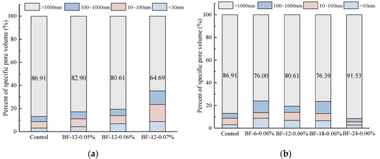 Percent of specific pore volume of BFRCs with different (a) BF content; (b) BF length.