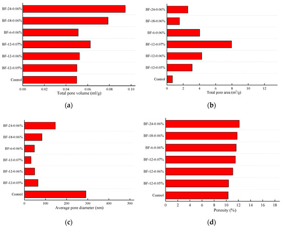 Pore structure parameter of BFRCs. (a) Total pore volume; (b) Total pore area; (c) Average pore diameter; (d) Porosity.