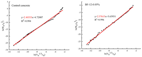 To quantitatively assess the parameter for the pore size distribution of concrete matrices by BF, the fractal dimensions of the pore surfaces were calculated based on the thermodynamic method proposed by Zhang et al. [35,36]. The expression is given as follows.