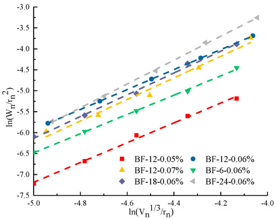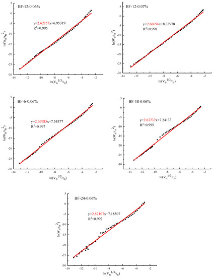where Wn is the cumulative intrusion work, Wn = , and Pi (psia) and Vi (mL/g) are the mercury intrusion pressure and the intrusion volume at the ith intrusion of mercury; , Vn (mL/g) is the accumulative intrusion volume, rn (nm) is the pore diameter, and C is the model constant. According to Equation (4), after calculating and , is plotted versus in log-log coordinates. Ds is determined as the slope value of the fitting line.