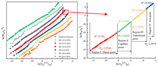 Moreover, by using Zhang’s model, Kim et al. [36], Zhu et al. [38] and Li et al. [26] also determined the fractal characteristics of cementitious-based materials with various pore diameters. Similarly, the fractal dimension of the pore surface was evaluated in different regions, as shown in Figure 10. Pores are divided into four specific regions. Thus, the FD of each region is calculated, and the results are given in Table 5. In general, the pore structure of BFRCs presents significant fractal characteristics in four regions, and the fractal dimension follows Dm < Dc < Dt <Dg, indicating that the smaller the pore size is, the more complex the pores are. In Regions I and II, Dm and Dc of the control concrete are smaller than those of the BFRCs. However, in Regions III and IV, the Dt and Dg of the control concrete are higher than 3.0, which is not in conformity with the basic assumption of Zhang’s model. Some researchers attributed this phenomenon to the existence of ink-bottle pores. In the investigation of Yu et al. [39], the results indicated that many ink-bottle pores were present in pore sizes ranging from 20 to 100 nm. Xiao et al. [40] also reported that the ink-bottle effect exists in both capillary pores and gel pores. BF shifts the peak of the pore size distribution curve from right to left, decreasing the most likely aperture of concrete, and the increment of the interface area between the fiber and concrete leads to an increase in capillary pores and transition pores, which finally results in an increase in FD in Regions I, II, and III. The difference in Dg between BFRCs is not as obvious as Dm and Dc. This can be ascribed to the fact that the properties of gel pores are closely related to the hydration products [36]. BF is an organic fiber and is not involved in the hydration process; thus, the Dg values of BFRCs are close to each other.