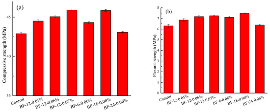 The obtained compressive and flexural strengths of the specimens with four different BF lengths and contents are displayed in Figure 11. Normal concrete was used as a reference. From Figure 11a, it can be seen that the addition of BF has a trivial effect on enhancing the compressive strength of the concrete. With increasing BF content, the compressive strength of the BFRC increases. However, as the BF length increases from 6 mm to 24 mm, the compressive strength value first increases steadily and then decreases. The highest value for the compressive strength is obtained from the concrete mixture incorporated with a content of 0.06% fiber having a length of 12 mm, which indicates a 7.02% increase in compressive strength compared to the control concrete. BF-24-0.06% presents the smallest compressive strength among the BFRCs. This may be attributed to two aspects. On the one hand, long fibers are more difficult to disperse evenly than short fibers. On the other hand, voids introduced during BFRC preparation are difficult to fully eliminate through vibration due to decreased workability.
