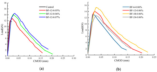 CMOD curve of BFRCs with different (a) BF content; (b) BF length.