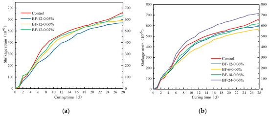 Drying shrinkage development curve of BFRCs (a) with different fiber content; (b) with different fiber length.