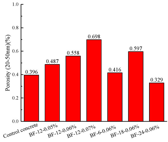 The percentage of specific BFRC pore volume is given in Figure 6. In Figure 6a, the addition of BF increases the volume of pores with diameters less than 1000 nm, especially in BF-12-0.07%, and the volume of gel pores, transition pores and capillary pores increased significantly when compared with the control concrete. The reason may be that BFs connect large pores and increase the interface area, which results in an increase in the small pore volume. Figure 6b presents the pore volume of BFRCs with various fiber lengths. It can be seen that with increasing fiber length, the volume of gel pores decreases obviously. For BF-24-0.06%, the volume of pores with diameters less than 1000 nm is lower than that in the control concrete.
