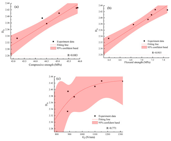 Relationship between Dm with (a) compressive strength; (b) flexural strength; (c) fracture energy.