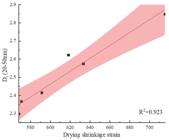 Table 8 lists the results of the average correlation coefficient (γi). It can be seen that for flexural strength, compressive strength and fracture energy, the order of the grey correlation coefficient is Dm > FD > another factor. Especially in the coefficient of strength and Dm, the γi of Dm is over 0.9. From the analysis in Table 7, regression analyses are performed on our experimental data comprising the compressive strength, flexural strength, fracture energy and Dm of the BFRCs, as shown in Figure 16. The compressive strength, flexural strength and fracture energy of the BFRCs increase with increasing Dm, and the correlation coefficients are relatively high. The strength is mainly determined by macropores and gel pores, and the influence of macropores is more notable. Dm reflects the complexity of the entire macropore; therefore, it is reasonable to find that Dm exerts a higher R2 with strength compared with FD. For drying shrinkage, the highest γi between shrinkage strain and pore factors is the transition porosity; however, it is obviously smaller than that of γi between Dm and strength. As mentioned above, the porosity of small transition pores (20–50 nm) was closely related to drying shrinkage, and the Dt with diameters ranging from 20 to 50 nm was calculated by using Zhang’s model, as shown in Figure 17. The relationship between Dt (20–50 nm) and shrinkage strain is also given in Figure 18, and good linear correlations are obtained. Generally, a high value of Dt is a reflection of a large transition pore content, which also means that a large water loss reduces the concrete weight. Thus, a high shrinkage strain could be expected. These results also reveal that the proposed approach may be a rational and effective way to evaluate the properties of BFRCs by using fractal dimensions calculated in different pore size ranges.