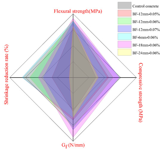 The macro properties of the control concrete and six kinds of BFRCs are displayed in Figure 19, which clearly shows the difference in performance among all the concretes. For ease of comparison, the shrinkage reduction rate was used as a representative parameter of shrinkage properties. Thus, we can roughly compare the overall performance of the concrete by comparing the area under the curve. It can be observed that BF-24 mm-0.06% presents the smallest closed area among all BFRCs. However, the order of other BFRCs in comprehensive properties is not clear. To select the optimal fiber length and content, grey target theory analysis was used.