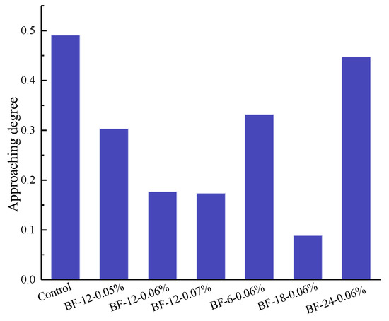 Figure 20 shows the approaching degree to the optimal properties (strength, fracture performance, shrinkage) of the control concrete and the BFRCs. The figure indicates that the closer to the center point, the better the concrete performance is. The properties of BF-18 mm-0.06% rank first, followed by BF-12 mm-0.07% and BF-12 mm-0.06%, and BF-24 mm-0.06% came last among the BFRCs. Therefore, concrete with 18 mm BF length and a BF content of 0.06% exhibits the best comprehensive performance among all the BFRCs.