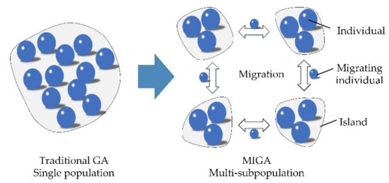 In traditional parameters optimization of Kriging modeling, the generalized pattern optimal algorithm is often used in the sense of maximum likelihood [37]. The Kriging parameters optimization problem is shown in Equation (12). However, owing to the sensitive dependence on initial point, this pattern optimal algorithm often falls into local optimum and resulting in unacceptable prediction error. Moreover, the objective function in Kriging modeling shows complex multi-modality characteristics (shown in Figure 1) in probabilistic fatigue life evaluation, which increases the difficulty to find the global optimum. In this case, to avoid the complex gradient calculations and guarantee the optimization effect, an intelligent algorithm called the dynamic multi-island genetic algorithm (DMIGA) is proposed. DMIGA generates the potential optimums as individuals in several islands (or populations), and then chooses the best-performance individuals to evolve into the next iteration. As the individuals evolving and migrating between multi-islands [23], population diversity is ensured, and the global optimum is finally acquired. The migration operation of DMIGA is drawn in Figure 2.