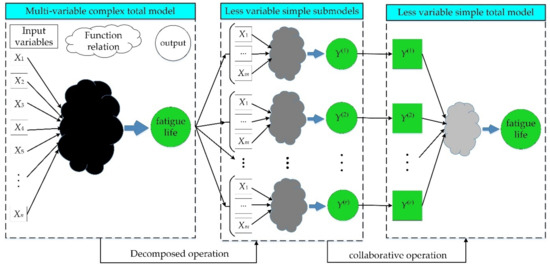 The above decomposed collaborative modeling process can be vividly drawn in Figure 5. Namely, the complex IKM model of overall fatigue life prediction is first divided into decomposed IKM sub-models at different layers (Equation (18)), and then the collaborative IKM (Equation (19)) is achieved to perform the probabilistic calculations. This method is called as decomposed collaborative intelligent Kriging model (DCIKM) method, which is suitable for multi-layer and multi-response probabilistic fatigue life evaluation.