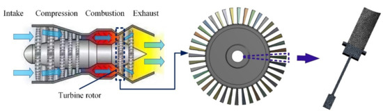 To reduce the computational complexity and task volume, 1/40 of turbine rotor [3] are selected as study object. The schematic diagram of aeroengine turbine rotor is shown in Figure 6. Based on the coarse grid division, we improved the grid quality by setting the “minimum size” as 4.5 × 10−3 m and “minimum edge length” as 1.9995 × 10−3 m, and refined the local mesh of blade root by setting “element size” as 3.6 × 10−3 m. From the convergence effects and simulation accuracy in reference [3,30], with the set meshing procedures, the meshing effects is guaranteed effectively. As shown in Figure 6, the FE model of simplified turbine rotor involves 18,454 quadrilateral elements and 30,911 element nodes. Moreover, an appropriate symmetric boundary constraint is imposed on the sector disc, and axial and circumferential constraints are loaded on the inner diameter arc. Furthermore, for facilitating the fatigue life calculation, we simplify the actual complex load spectrum of turbine rotor into the trapezoidal load spectrum [32].
