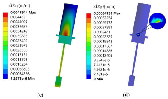 By importing the mean values of material properties and load parameters into FE model, thermal-structure coupling analysis is performed, the maximum stress and the temperature distribution of turbine rotor are acquired in Figure 7a,b, respectively. From the stress and temperature distribution, we find that the back section in blade root is the critical point and its stress and temperature are 779.4 MPa and 778.35 K, respectively. Since the turbine rotor does not generate compressive stress, then the negative half axis in hysteresis loop does not occur. Therefore, we regard the residual strain as plastic strain range, and the difference value between total strain and plastic strain range as elastic strain range. The elastic strain and plastic strain distribution are shown in Figure 7c,d. To clearly exhibit the distribution traits of plastic strain range, we further enlarge the plastic strain area. which is drawn in Figure 7d. Note that the material occurs plastic strain in critical point as shown in Figure 7d, which needs to be considered in fatigue life evaluation. Considering the maximum stress cycle 0-σmax-0, the mean stress σm is obtained as 0.5 × (σmin+σmax). With the calculated mean stress σm, elastic strain range ∆εe, plastic strain range ∆εp and Manson–Coffin model, the low-cycle fatigue life of turbine rotor is obtained as 3606 cycles. Manson–Coffin model is shown in Equation (27).