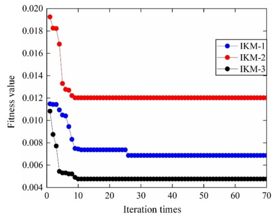 According to the distribution characteristics of input variables in Table 1; Table 2, 107 sample data sets are extracted and be imported into FE simulation, to calculate the actual output responses (mean stress, elastic strain range, plastic strain range) sample data. The sample data sets are generated based on Latin Hypercube Sampling [45,46], which is promising to ensure that the generated sample covers the whole sampling domain. Then the 107 input variables & output responses are divided into training groups and test groups, where 30 for test groups and the remaining for training groups. Considering the training samples and decomposed IKM thought, the optimal decomposed IKMs for mean stress (decomposed IKM-1), elastic strain range (decomposed IKM-2) and plastic strain range (decomposed IKM-3) are constructed, the modeling process of decomposed IKMs with DMIGA is shown in Figure 8. From Figure 8, we discover that the stable optimization results can be obtained only through few iterations, which verifies the modeling efficiency of the proposed DMIGA. Moreover, by comparing real test outputs with the estimated outputs, the prediction effect of decomposed IKMs are obtained in Figure 9. Note that the data in Figure 9 comes from the testing dataset.