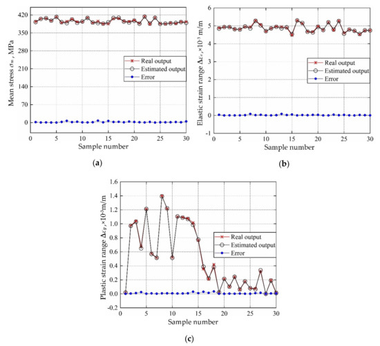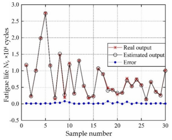The model parameters (fatigue strength exponent b, fatigue ductility exponent c, fatigue strength coefficient σf′, fatigue ductility coefficient εf′) and decomposed output responses (mean stress σm, elastic strain range ∆εe plastic strain range ∆εp) are taken as input variables of collaborative IKM, and the fatigue life of turbine rotor is taken as total output response. Similar to the establishment of decomposed IKM, 107 groups of samples are extracted, where 30 samples for testing samples and the remaining for training samples. The modeling process of collaborative IKM with DMIGA is shown in Figure 17. Through the comparison of real test outputs with the estimated outputs, the model performance of collaborative IKM is validated in Figure 18. Note that the data in Figure 18 comes from the testing dataset.