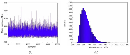 Fatigue life of turbine rotor: (a) simulation history, (b) probabilistic distribution.