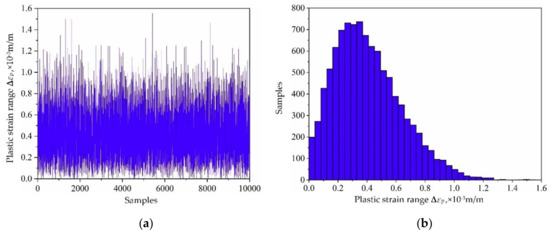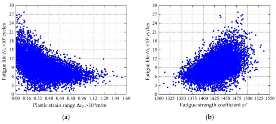 Considering the collaborative IKM and the sensitivity analysis formula in Equation (25), the sensitivity analysis is accomplished, the sensitivities and influence probability of the input variables on fatigue life are obtained in Figure 20. The results show that plastic strain range ∆εp and fatigue strength coefficient σf′ are the main factors affecting the fatigue life, accounting for 28% and 22%, respectively. Therefore, ∆εp and σf′ should be preferentially regarded in fatigue reliability design of turbine rotor. Moreover, we also find that the decrease of ∆εp will result in the increase of fatigue life, while the increase of σf′ will lead to the increase of fatigue life. The correlation between fatigue life and main influencing parameters are depicted in Figure 21. Note that the scatter points in Figure 21a are close to the Y-axis is owing to some plastic strain range responses are near to zero.