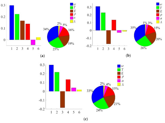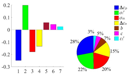 Sensitivities and effect probabilities with different decomposed output responses: (a) mean stress σm, (b) elastic strain range ∆εe, (c) plastic strain range ∆εp.