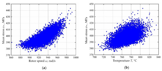 Scatter sketches of mean stress: (a) rotor speed, (b) temperature.