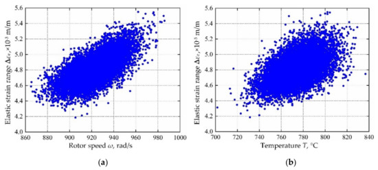 Scatter sketches of elastic strain range: (a) rotor speed, (b) temperature.