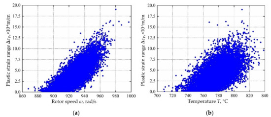 Scatter sketches of plastic strain range: (a) rotor speed, (b) temperature.