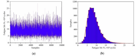 Regarding the distribution features of four model parameters in Table 2 and the three decomposed output responses as input variables, the fatigue life Nf are obtained by simulating the collaborative IKM with 10,000 simulations. The simulation history and distribution feature of fatigue life Nf are shown in Figure 19. Obviously, the fatigue life Nf nearly obeys log-normal distribution. In view of the reliability analysis theory in Equation (24), the probabilistic fatigue life under reliability 99.87% is 3296 cycles. It should be noted that 3296 cycles are the probability fatigue life corresponding to 10,000 simulations, and the operating hours corresponding to 3296 cycles based on the flight load spectrum [32] are 1207 h.