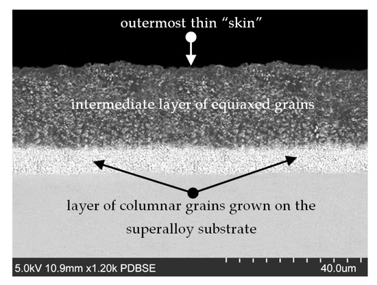 A representative SEM image (SU-70, Hitachi, Japan) of a cross-section of the aluminide layer deposited on the blade made of the superalloy in question is shown in Figure 1. Taking into account the duration of the aviation tasks, the time of the exposure to the temperatures applied in the current study was 1 h.