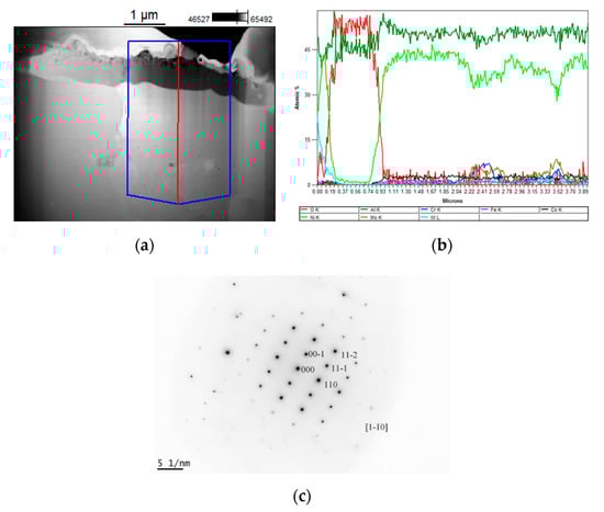 Microstructures, linear scans of the chemical composition, and phase identification representative of layers on the nickel superalloy: (a) STEM image of a cross-section; (b) linear scans of alloying elements; (c) Selected Area Diffraction (SAD) pattern of the NiAl disordered alloy.