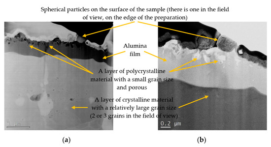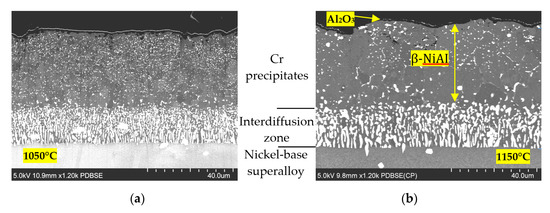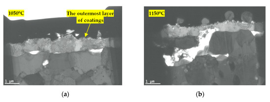 The TEM images of cross-sections of blades exposed to the temperatures of 1050 and 1150 °C are shown in Figure 5.