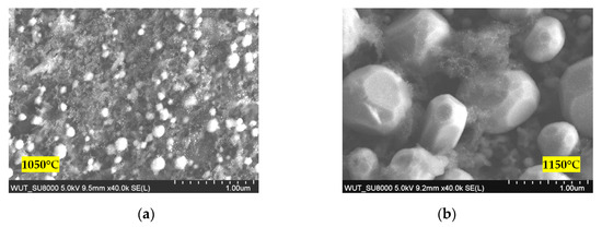 The morphologies of the surfaces of samples exposed to temperatures of 1050 and 1150 °C are shown in Figure 4.