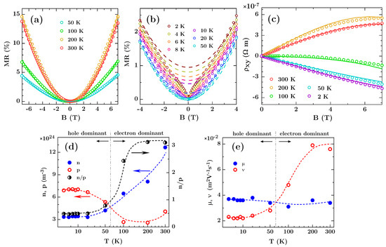 The Hall curves in entire temperature range are symmetrical with respect to the origin under negative and positive magnetic field, so only one half of the characteristics is presented (see Figure 2c). The evolution of the Hall curves with temperature and change of the sign of Hall coefficient clearly show a transition from p-type to n-type conduction with the increasing temperature. Such behavior can be described in the framework of the two-carrier model, where the longitudinal and transverse components of the resistivity are given as [32,33,34]: