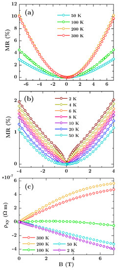 The magnetoresistance (MR) and transverse (Hall) component of the resistivity measured in the range of −7 T < B < 7 T for various temperatures are depicted in Figure 2a–c. Figure 2a shows the magnetoresistance results for temperatures 50 K and higher, while Figure 2b depicts the magnetoresistance at a low temperature range from 2 to 50 K. MR is defined as MR(%) = 100 × [ρxx(B,T) − ρxx(B = 0,T)]/ρxx(B = 0,T) and shows quadratic behavior without saturation for temperatures above 10 K, which is a typical attribute seen in the classical MR phenomena. Deviations from the classical behavior are only observed for the low magnetic field below 2 T at temperatures below 20 K. The largest MR of up to 15% appears at 200 K, which is three times higher than that at 2 K and is comparable to values reported in other works [9,10,21,22].
