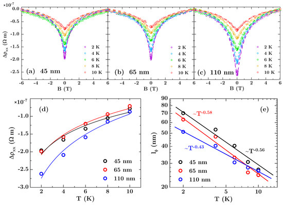 where T0 is the characteristic temperature for the onset of decoherence, t is the film thickness, ρ is the resistivity, e is the elementary charge, and is the exponent in the quantum dephasing power law for the phase coherence length lϕ ~ . Fitting Equation (3) to the data yields the red line in Figure 3b. From this fit we obtained the power law dephasing exponent ≈ 1.05 ± 0.07, which is expected for a 2-dimensional electron system [3], while the obtained characteristic temperature is T0 ≈ 30 K ± 4 K. Following the Hikami, Larkin, Nagaoka (HLN) theory [39], the correction to the resistivity Δρxx(B), due to the weak antilocalization in the 2-dimensional case, can be described as [13,22,41]: