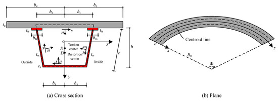 The geometric dimensions and coordinate system of the curved composite box beam are shown in Figure 1, wherein oxyz is a three-dimensional flow coordinate system that passes through the centroid line, the ox-axis is parallel to the concrete slab and points to the curvature center of the box beam, the oy-axis is straight downward, and the oz-axis coincides with the undeformed axis of the beam. Moreover, the tangential directions of every thin-walled bar in the sections of the box beam are set as the s-axis, and the normal directions of every thin-walled bar in the sections of the box beam are set as the n-axis.