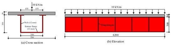 Geometric dimensions and load layout of the curved composite box beam used for validation (unit: mm): (a) cross section, (b) elevation.