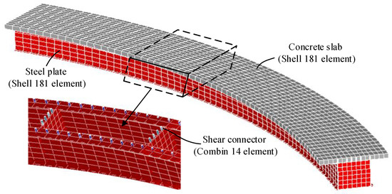 The elaborate finite element model of a curved steel–concrete composite box beam is established in ANSYS. The concrete slabs, steel beams, and transverse diaphragms are modeled with Shell181 elements, whereas the shear connectors are modeled with Combin14 elements. The finite element model is shown in Figure 3.