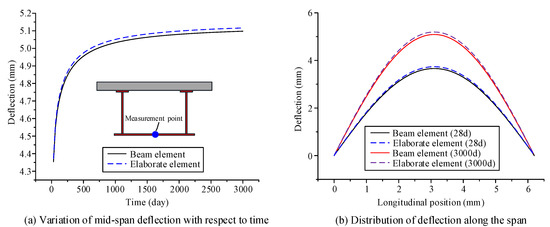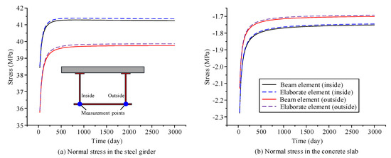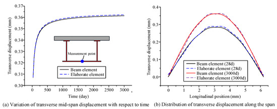 The parameters of the material and environment of the proposed beam element model and the elaborate finite element model established in ANSYS are as follows: The elastic modulus of steel Es and Poisson’s ratio of steel μs are 2.06 × 105 MPa and 0.3, respectively; the calculation of the creep behavior of concrete in the two models use the age-adjusted effective modulus method; and the Poisson’s ratio of concrete μc is 0.2. The elastic modulus formula and the shrinkage creep model are obtained within CEB-FIP90 [24]; the drying age of concrete is three days, the relative humidity in the environment is 75%, and the initial loading age t0 is 28 days. Using the finite beam element model and the elaborate finite element model, time-dependent changes in the deflection, transverse displacement, and stress of the curved composite box beam were calculated from the loading age to 3000 days, as shown in Figure 4, Figure 5 and Figure 6. From these three figures, the accuracy and applicability of the proposed two-node finite element with 26 DOFs are verified due to the good correlation between the results of the elaborate finite element model and those of the finite beam element model. Notably, the proposed beam element model and the elaborate FE model took 7 and 53 s to obtain the long-term behavior of the curved composite beam, respectively. It can be known that the calculation efficiency of the proposed beam element model is much higher than that of the elaborate FE model.
